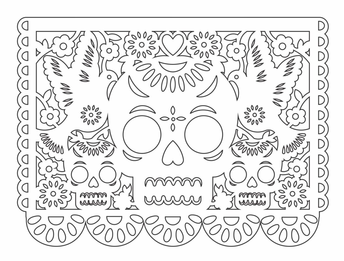 Descubre un vector descargable ideal para crear un papel picado 🎉 con diseño de calaveras y palomas voladoras. Perfecto para decorar tus fiestas y celebraciones 🕊️. ¡Da rienda suelta a tu creatividad con este hermoso recurso!